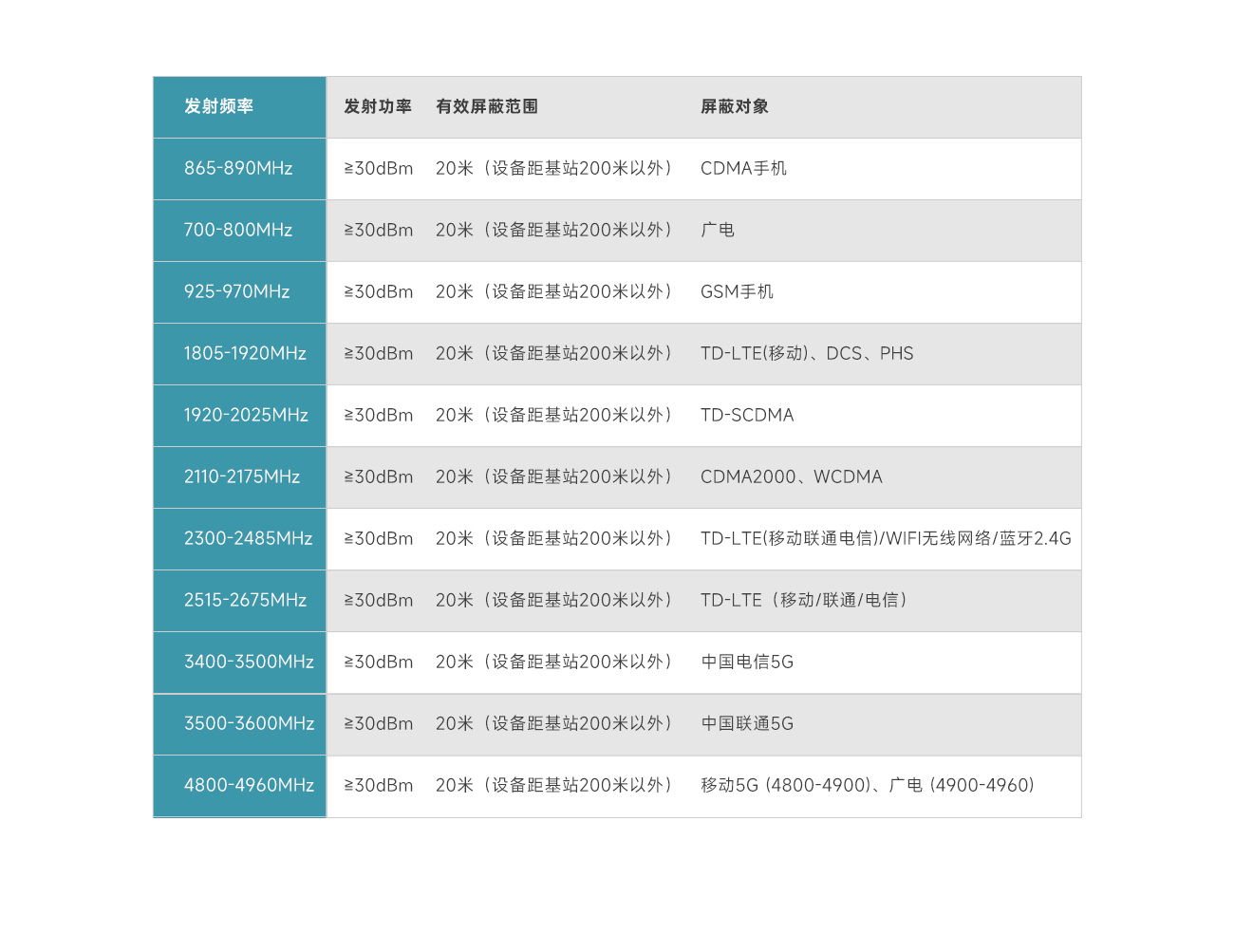 屏蔽信号频段有效屏蔽(干扰)考场内的所有手机信号(广电、CDMA、GSM、DCS、PHS、3G、4G、5G)和WIFI(WLAN) 、蓝牙/2.4G 通讯、无线网络(QQ和微博等)、针孔摄像头信号